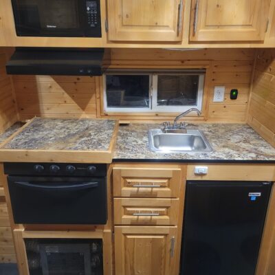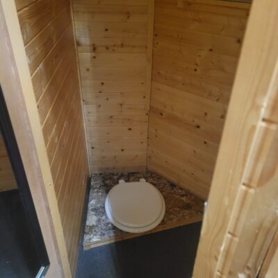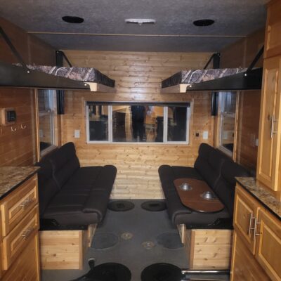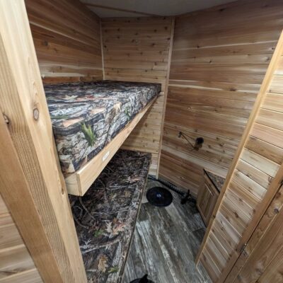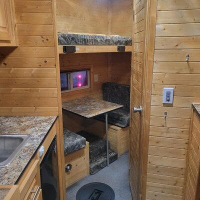 Our 21′ Red Trophy Hunter is a great option for families or larger groups. There are two couches in the back of the house with bunks that fold down above them. There are also two bunks in the front of the house making a total of 6 individual beds. As with all of our houses, this house includes a Smart TV, paper products, an assortment of plastic cutlery, plastic glasses and your basic cooking utensils and a couple of pots and pans. Toilet paper and bags are provided for the bucket toilet. We stop by the house multiple times a day to check in with guests and provide the latest fishing reports.
